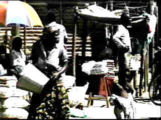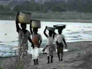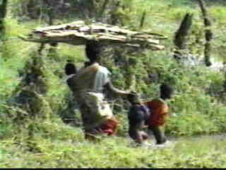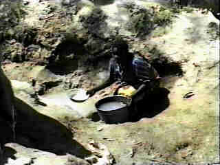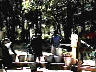 | Throughout the day women pump or dip water and carry it home. If there is any money available, there may be a walk to the market to buy some of the things that can't be or aren't grown at the home. And of course, there are always children to care for. | |