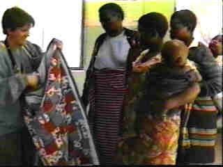 | In the Nutritional Rehabilitation Unit, mothers live with their malnourished babies and learn how to provide more nutritious foods for them. The unit raises goats, rabbits and chickens and grows a demonstration garden. When these mothers and children "graduate" from the NRU, they are given vegetable seeds to grow at home and sometimes other "prizes" such as these quilts made by Girl Scouts in Virginia. | |