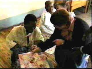| I spent each day doing individual speech therapy. With 42 children, there was only time to spend 10 minutes once or twice a week with each child. Despite the language barrier -- they speak ChiTimbuka, I do not, some progress was made. Materials were scarce. The headmaster proudly gave me my supplies; one pencil, one ruler and one piece of chalk. I made flash cards by tearing my business cards into four pieces and writing on the back. I also provided the teaching staff with sign language classes and tutorial sessions for speech therapy after official school hours. | |
