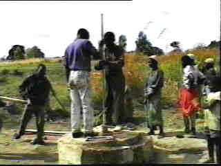 | One of the most exciting mission projects at Embangweni is the building of shallow wells. Replacing the typical stagnant water holes with their potential for disease, these wells provide a relatively clean source of water. Villagers dig the well -- usually 10 to 20 feet deep --, line them with locally made brick and form a committee to keep the well area clean. Pumps are built at the hospital; shallow well teams are trained to install and maintain them. Each well costs around $300 and provides water for about 250 people. | |